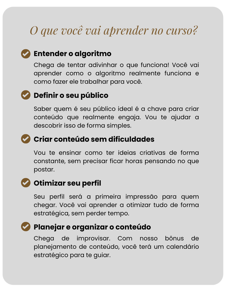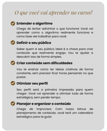 Você vai entender como o algoritmo do Instagram funciona e como utilizá-lo a seu favor. Vamos te ensinar estratégias práticas para aumentar seu alcance e engajamento de forma orgânica.